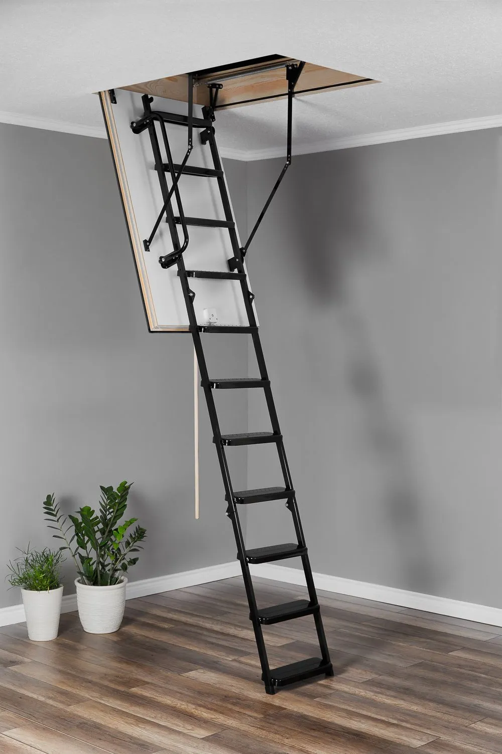 Износоустойчивая лестница для холодных помещений, приспособлена, как для частого использования так и для продолжительного простаивания. Белый цвет крышки люка (толщина 3,3 см) гармонично интегрируется в интерьер помещения и закрывается, маскируясь в один уровень с потолком.