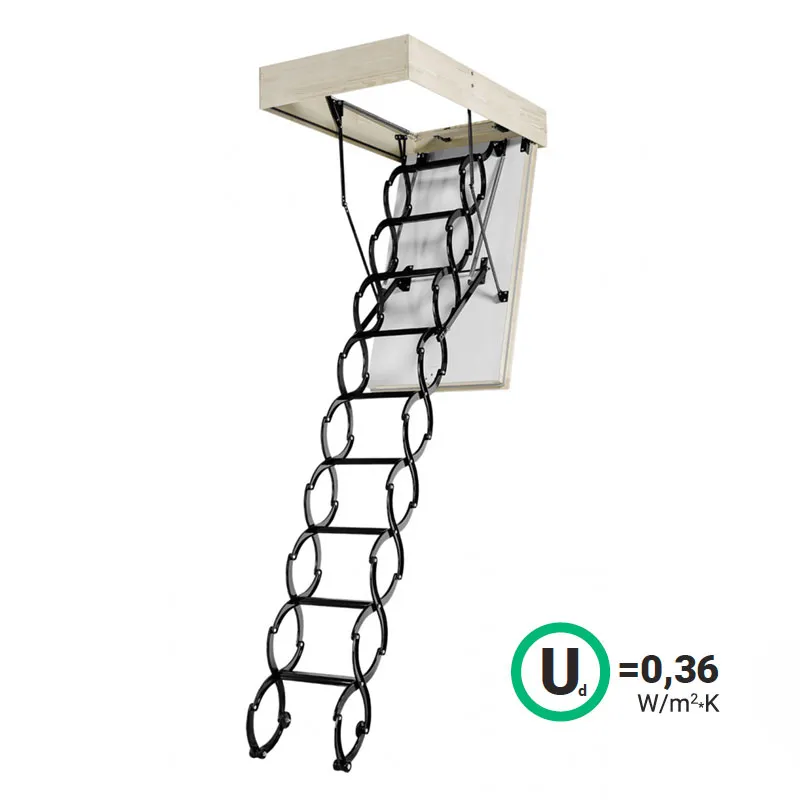 Модель лестницы, благодаря использованию цельнометаллической ножничной конструкции, идеально подходит для установки в помещениях высотой до 290 см. Выбор лестницы NOZYCOWE TERMO SUPER - это инвестиция, которая позволяет минимизировать потери теплого воздуха  и значительно снизить расходы на отопление.