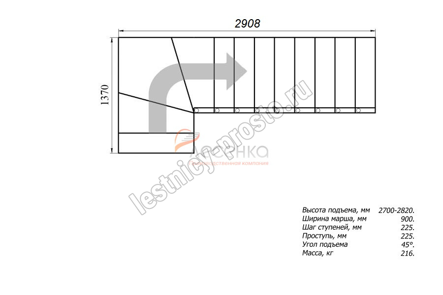 Модульная лестница Фаворит 225 2700-2820, Серый, Лиственница, Нержавеющая сталь