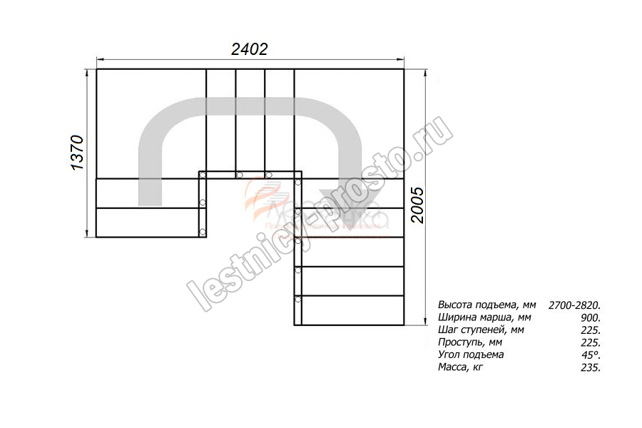 Модульная лестница Комфорт 225 2700-2820, Черный, Сосна, Нержавеющая сталь