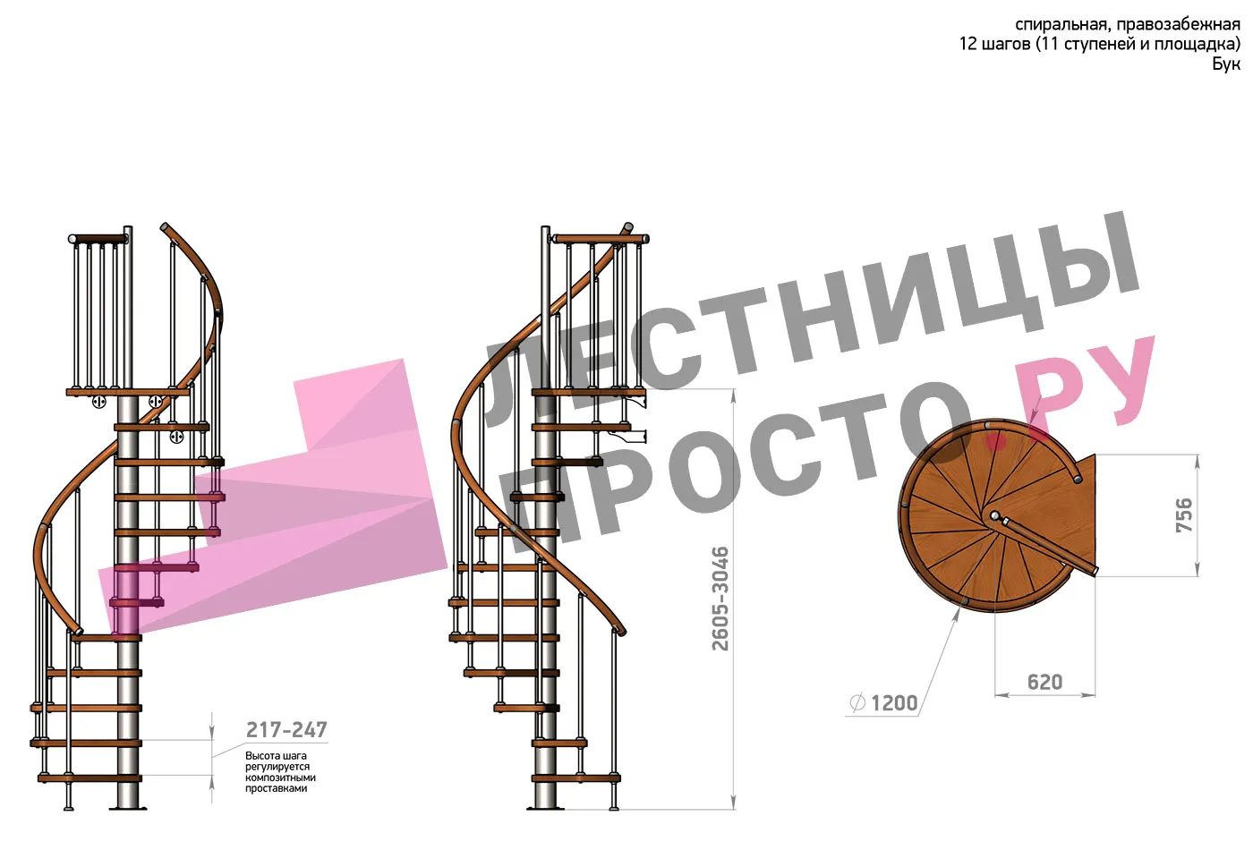 Правая, d=120см, 11 ступеней + площадка