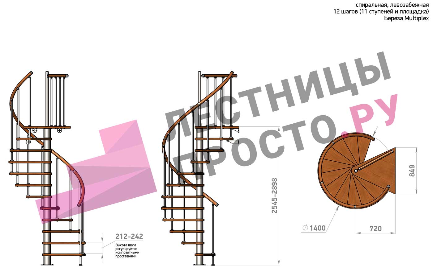 Лестница легко подгоняется по высоте благодаря композитным вставкам в каждом модуле, вариант с 11 ступенями адаптируется под высоту в пределах от 2545 до 2898 мм.