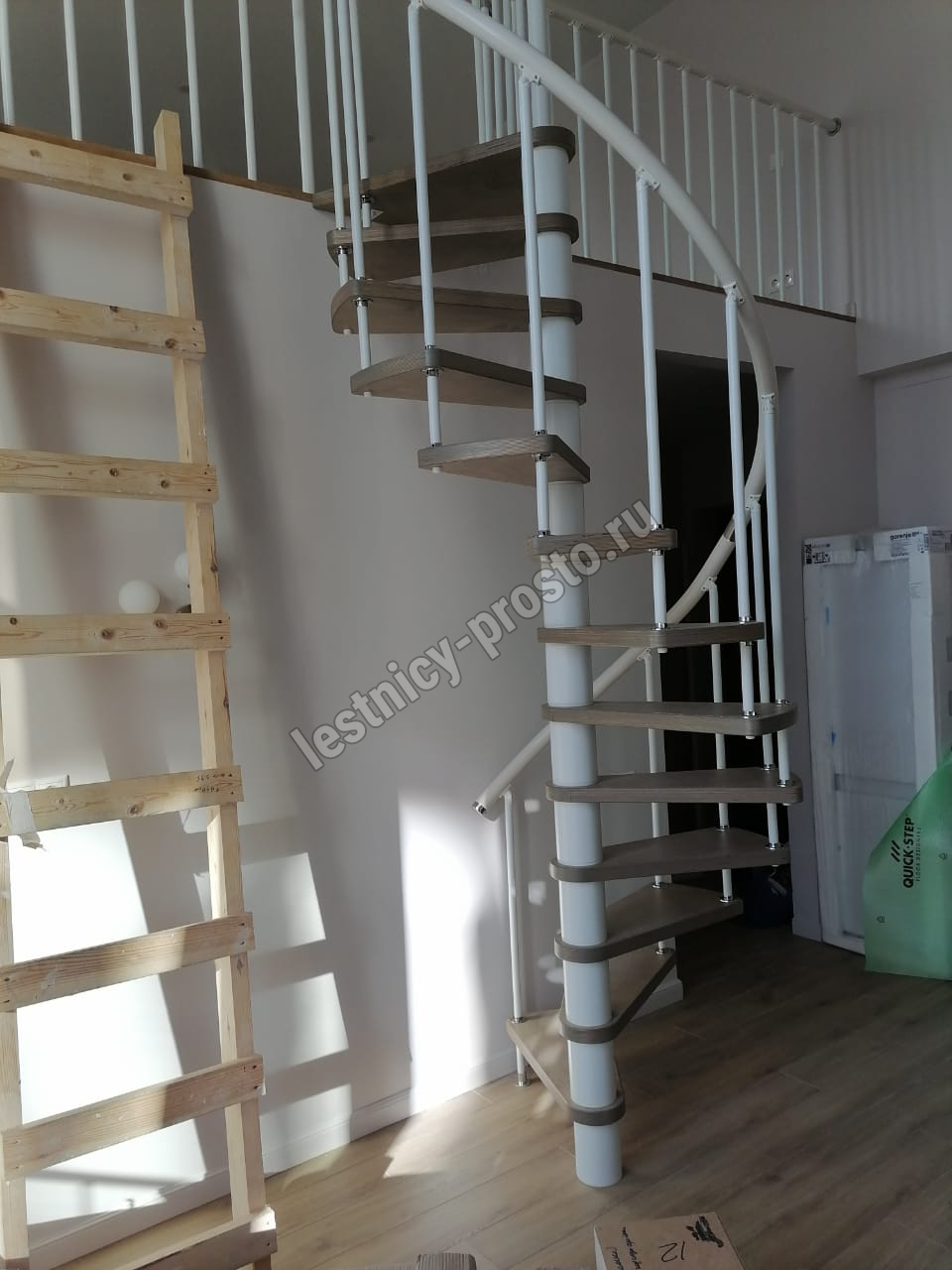 Лаконичная малогабаритная стильная винтовая модульная лестница с белым каркасом.